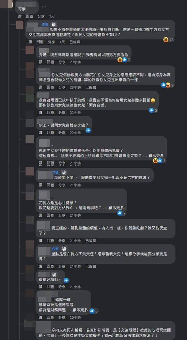 此外,由於事由的部分被馬賽克擋住,不少網友質疑,事情根本沒那麼單純,說不定是女兒開口向男方借錢,而非約會花費。該名媽媽則怒轟,「如果不清楚事情前因後果,請不要私自判斷,謝謝~難道現在男方女方交往花錢都要算這麼清楚?那我女兒的身體都不算哦?」