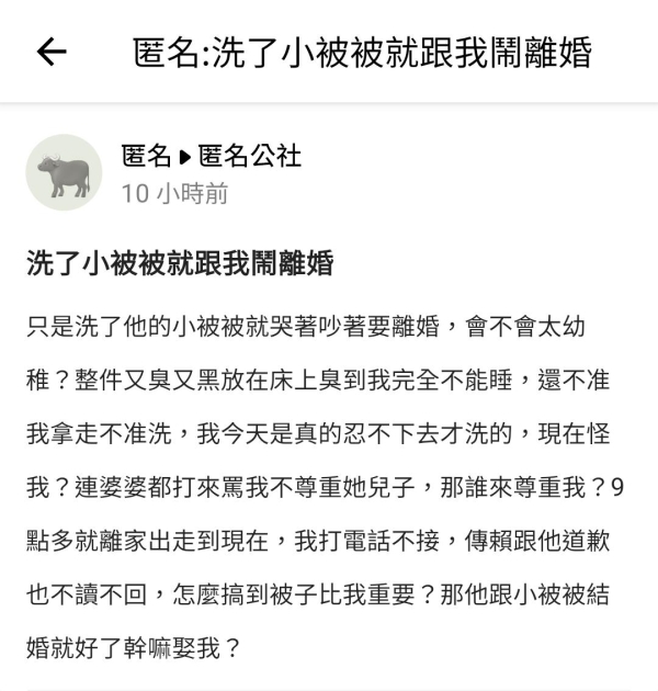 有社員在爆料公社app中的匿名公社,發文表示,自己只是洗了先生的小被被,他就離家出走還嗆離婚!!