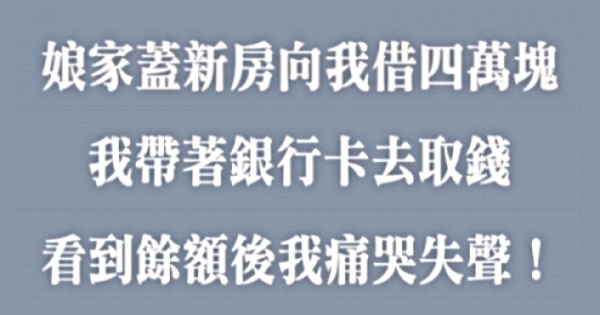 在銀行一直打電話給老公,他卻一直不接電話,但他這樣我也懂了他為什麼這麼做,不想讓我把錢給寄回家。他回家後供認把錢轉移了,說不能借,那是我們存錢為了買房,借了不行了,錢可能都回不來了,還說我們家沒錢建房子就連累女兒女婿。