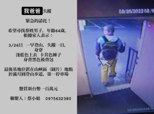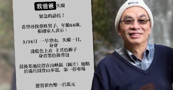 據悉,他在本月26日獨自前往新北市三峽滿月圓國家森林遊樂區登山,直到(27)日凌晨都未返家,手機也因訊號不佳而無法聯繫上,焦急的家屬趕緊到台北市六張犁派出所報案找人,更在網上發布懸賞100萬,盼能加入民間力量協尋。