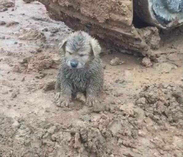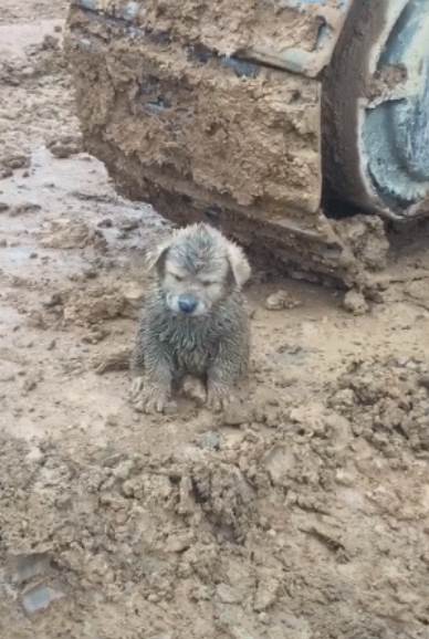 司機無奈下車查看,這狗狗渾身都是泥巴,