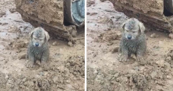 不知道什麼原因在泥濘的路上蹲坐著,