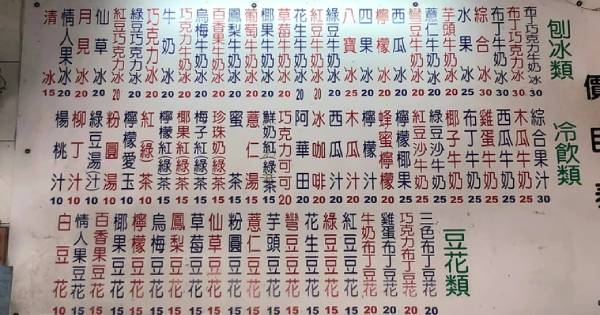 一名網友在臉書「爆廢公社二館」社團貼出牆上價目表,刨冰類最貴的品項為,布丁巧克力牛奶冰、布丁巧克力冰、布丁牛奶冰及綜合冰,一碗都是30元。