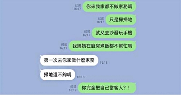 我之前也有帶女友回家,她們都會很自覺地做一些家務,不像這一個,好大的公主病,只是掃了一下地面,就坐在沙發上繼續看電視了,任由我媽在廚房煮飯也不幫忙,明明我去她家的時候還幫忙拎水桶和洗碗,怎麼她在我家住了幾天也不做一點家務?問她怎麼回事,她還認為第一次上門就讓做家務的婆婆不是好婆婆......