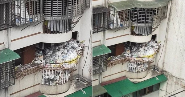 垃圾跟廢棄物多到不但占滿陽台,甚至滿到都快要掉到樓下的樣子。