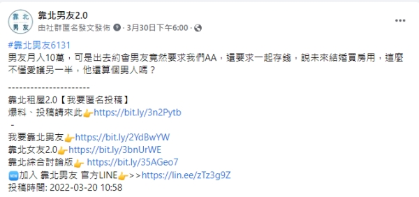 這名網友在臉書粉專「靠北男友2.0」上貼文,提到男友月收入10萬元,但每次出門約會,對方總要求AA制,更說雙方要一起存錢,這樣以後結婚才有買房基金。聞言,她就對男友的行為感到不解,認為對方實在太不懂得愛護另一半了,「他還算個男人嗎?」