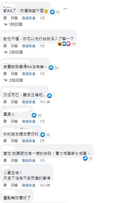 貼文曝光後,底下網友全傻眼回應,「覺得你愛他的錢比愛他的人多」、「老實說我覺得AA沒有錯」、「自己的錢自己付,應該的」、「一起存錢沒錯啊」、「那你還算個女人嗎?不懂得一起互相扶持」、「AA又沒什麼,一起存錢、買房也不錯啊,只是存的錢要分開,以防萬一」。不過也有少數人表示,「都AA了,你還指望什麼」、「他還不夠愛你」。