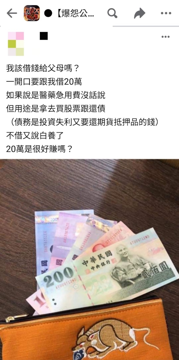 有社員在爆怨公社發文表示,父母投資失利,一開口就是要跟他借20萬,讓他非常苦惱。