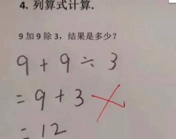 國小生三年級數學題,「9+9÷3=12」被打叉,質問老師反被打臉