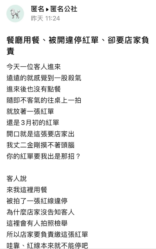 客人說來我這裡用餐被拍了一張紅線違停,為什麼店家沒告知客人這裡會有人拍照檢舉!