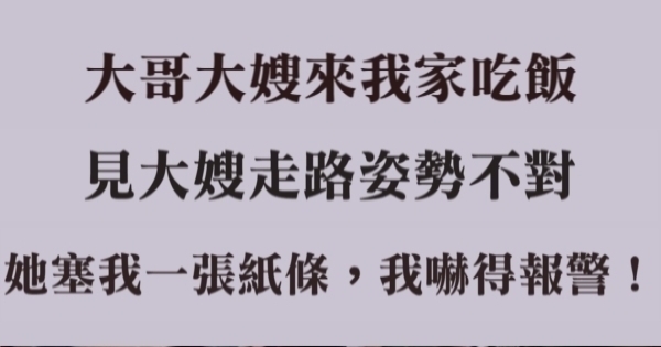 後來大哥拽著大嫂回家,她一直想向我求助,後來大嫂偷偷塞了一張紙條給我。看到紙條後,我當場嚇得跑去報警!大嫂在紙條裡寫著:“求求你救救我!