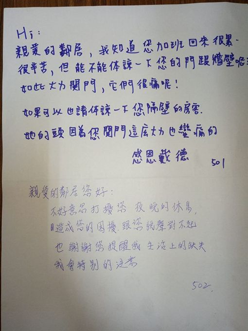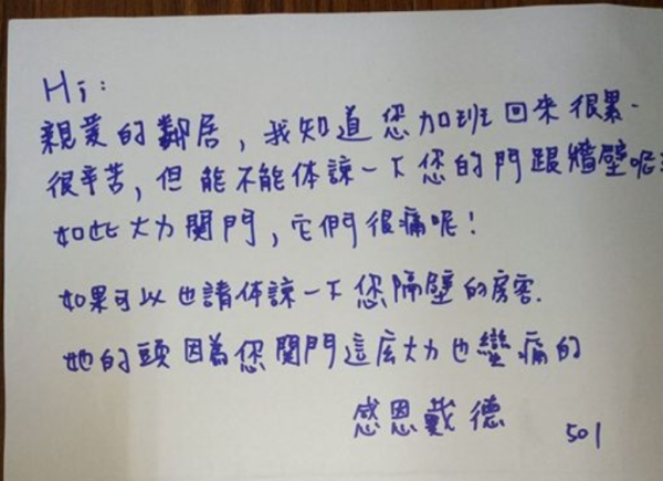 日前一名女網友就在臉書社團《爆廢公社》中發文表示,她住處隔壁的房客習慣大聲關門,砰的一聲常常大到牆壁、地板都在震動,而且每天晚上鄰居都會進出房間多達10幾次,即使到了深夜也一樣喜歡重重摔門,不堪其擾下只能寫紙條提醒對方,婉轉用可愛的方式寫下:「親愛的鄰居,我知道您加班回來很累、很辛苦,但能不能體諒一下您的門跟牆壁呢?如此大力關門,它們很痛呢」