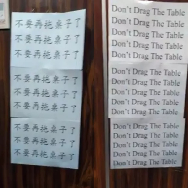 不過其實大部分鄰居爭端都沒那麼容易解決,之前就有網友在社區電梯裡看到超長的A4紙上寫滿「不要再拖桌子了」、「Don't Drag The Table」雙語訊息,看起來真的超崩潰...