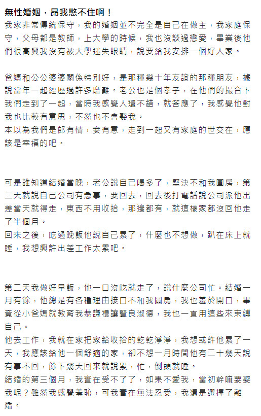 一位人妻委屈上論壇《匿名公社》吐苦水,表示自己生在傳統的家庭,從小到大都沒談過戀愛。