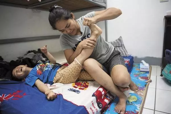 每天忙於工作之外,還會幫小兒子典典按摩拉筋,幫他撐開僵硬捲曲的手腳。