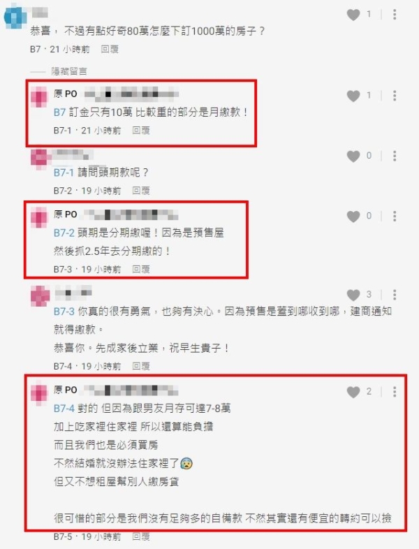 留言串中,有網友好奇問道「80萬怎麼下訂1000萬的房子?」原PO解釋,訂金只有10萬,比較重的部分是月繳款(約4至6萬),「頭期是分期繳喔,因為是預售屋,然後抓2.5年去分期繳的」,最後就是交屋款 =房價兩成-前面已繳的工程款及訂金的部分。