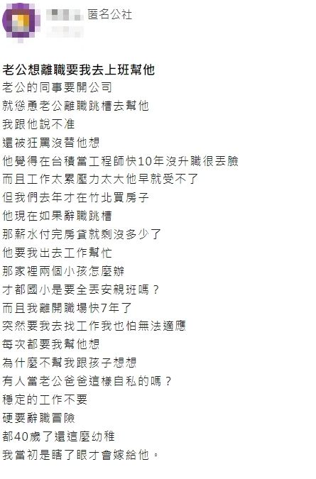 原因是老公在台積電很穩定,加上剛買房子又有雙寶要養,因此原PO極力阻止老公離職,而老公則希望能闖一闖,認為原PO可重返職場,一席話再度讓原PO氣炸。