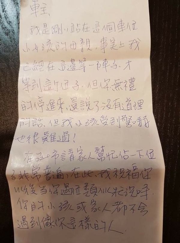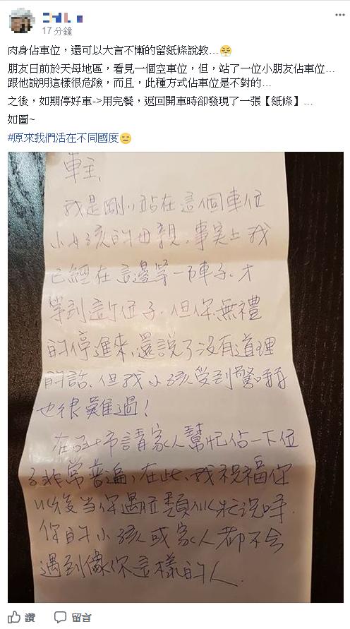 這名網友看到紙條後大怒,上網po出紙條並表示:「肉身佔車位,還可以大言不慚地留紙條說教...原來我們活在不同國度」