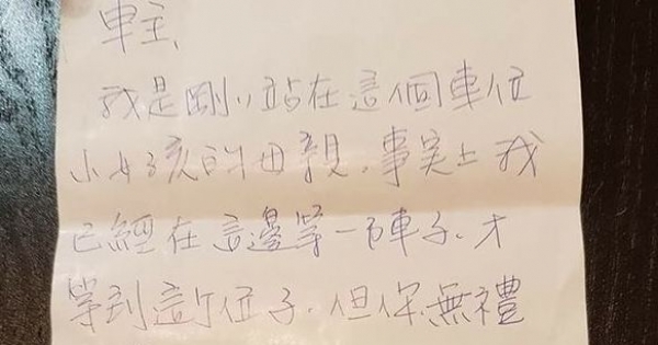 一名網友在臉書的社團《爆怨公社》分享了一張照片,並且表示,朋友於賣場停車時,發現一名女童在空位佔位置。當時原PO的朋友將女童勸離、告訴女童「這種佔位方式不對」,順利停好車後,卻收到一張女童家長寫的紙條。
