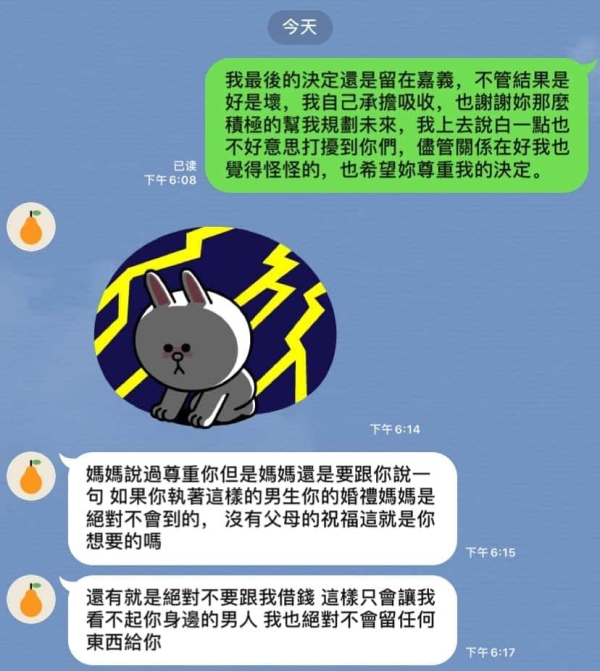 女網友百般思考之後,還是決定繼續留下來,在南部跟著男友一起打拚,孰料跟媽媽表達自己的意願之後,對方竟然撂下狠話,表示自己雖然說過尊重女兒,但接下來就開始抨擊「如果你執著這樣的男生,妳的婚禮媽媽是絕對不會到的,沒有父母的祝福這就是妳想要的嗎?」
