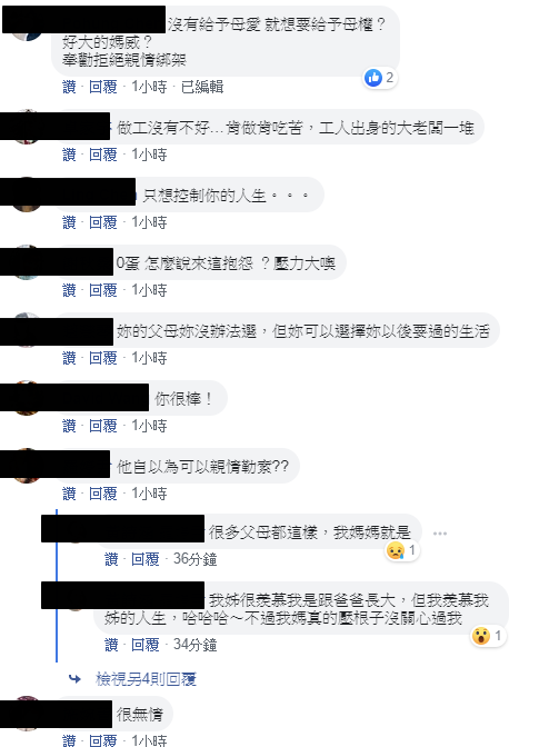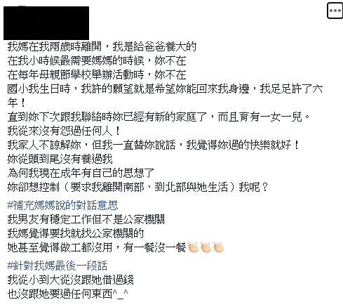 女網友補充表示,媽媽一直覺得做工的人不好,有一餐沒一餐,希望自己找個「公家機關男友」,另外也表示,這個「媽媽」其實從自己2歲的時候就跑出家門,自己都是給爸爸跟親戚帶大的,從幾何時母親節、小學的活動,她都許願希望媽媽可以到場,但是幾乎沒有一次出現,從期望轉變為失望,即便如此,自己還是在家族中替媽媽說話,覺得媽媽後來有了自己的家庭,還有孩子,只要過得開心就好,沒想到現在還想控制「根本沒有參與到人生」的女兒的思想讓她無奈:「從頭到尾沒有養過我!」