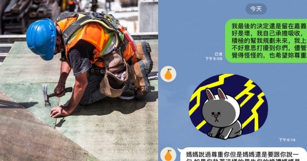 當時這名女網友表示,自己的男友是在工地上班,平常靠著勞力賺取辛苦錢,也算是滿不錯的好男人,孰料媽媽知道之後,竟然馬上傳訊息,希望她可以遠離現在的生活,除了從南部北上打拚之外,最重要的還是要跟男友分手,認為對方根本沒有辦法好好地照顧女兒。