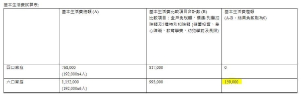 基本生活費總額為76.8萬元,無法享受基本生活費差額優惠;然而,假設若同樣條件的6口之家,計算後將有基本生活費差額15.9萬元,享受到基本生活費節稅優惠。