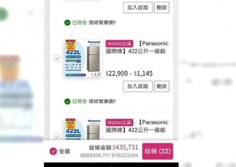 後來原PO接過手機查看,發現購物車內竟有20台冰箱等待結帳,扣掉優惠折扣2萬3066元,共計要43萬5731元,當下她相當傻眼,還好媽媽不會操作結帳,否則43萬元就要飛走了。