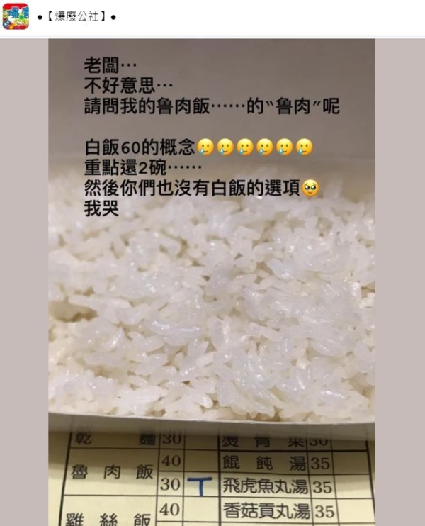 原PO在臉書「爆廢公社」的文章中提到,17日在宜蘭某小吃店買了2碗小份的滷肉飯,沒想到回家打開餐盒,裡面竟然只有白飯,相當於花了60元只買到2碗白飯,讓她超級傻眼,「老闆,我的『滷肉』呢?我哭。」