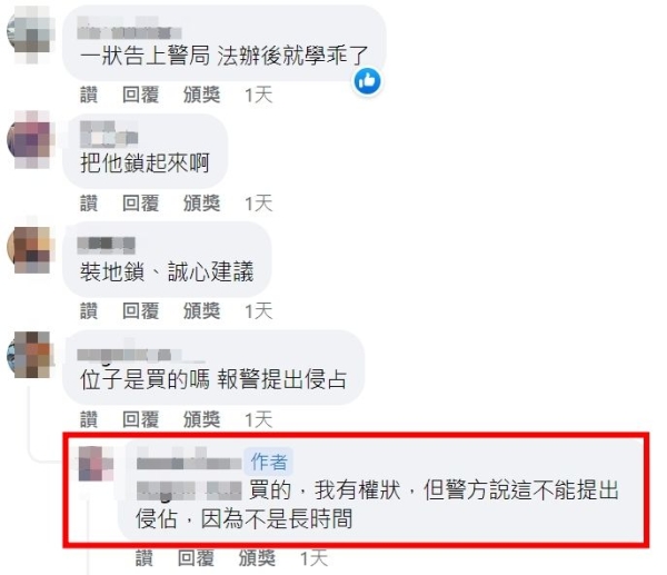 對此,網友熱心建議,「罰錢啊,我們開區權會時有通過亂停車罰500元」、「公告+地鎖」、「可以安裝路障,你開走時,路障開啟,任何一台車無法停,只有你可以停」、「先拍照蒐證,找律師詢問後續訴訟的程序,記住千萬不要和解,順便蒐證物業跟主委的不作為」。對於以上作法,原PO也崩潰直呼,剛搬來就遇到這種鳥事,且有車位權狀,偏偏管委會也不給裝地鎖,就連報警也沒用,「警方說這不能提出侵佔,因為不是長時間(停放)」。