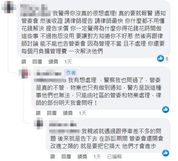 更讓原PO感到心累的是,管委會主委不介入處理,而物業保全也束手無策,「該如何自保?心裡真的很差,車牌也不想馬賽克了...快救救小弟呀!」