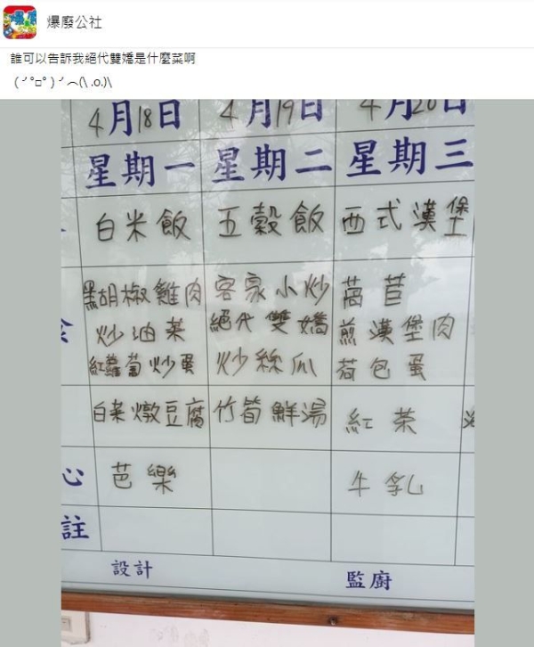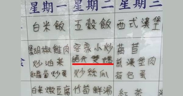 原PO在臉書「爆廢公社」PO出一張照片,是某所小學的一週菜單,週一有白米飯、黑胡椒雞肉、炒油菜、紅蘿蔔炒蛋、白菜燉豆腐,週二有五穀飯、客家小炒、絕代雙嬌、炒絲瓜、竹筍鮮湯等等。