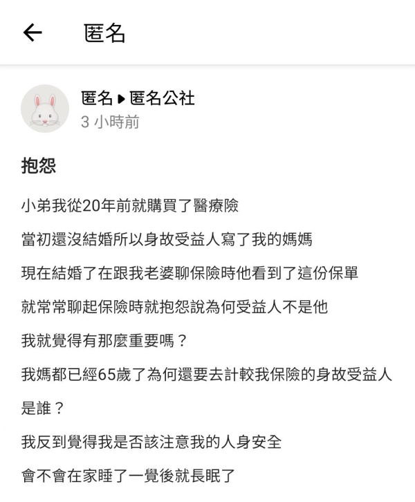 有網友在爆料公社app中的匿名公社,發文表示,婚後太太發現保險受益人是不是她後就常抱怨,他不解[有那麼重要嗎?]