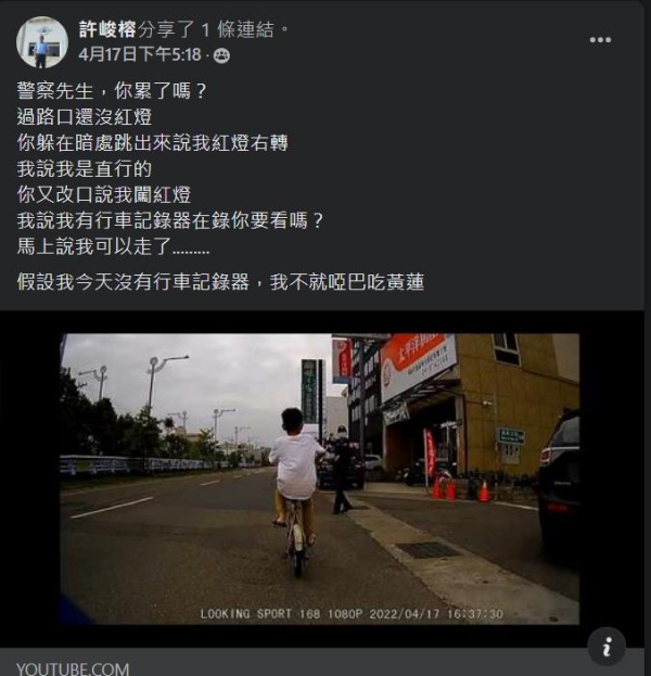 「警察先生,你累了嗎?過路口還沒紅燈,你躲在暗處跳出來說我紅燈右轉,我說我是直行的,你又改口說我闖紅燈我說我有行車記錄器在錄你要看嗎?馬上說我可以走了.........假設我今天沒有行車記錄器,我不就啞巴吃黃蓮」