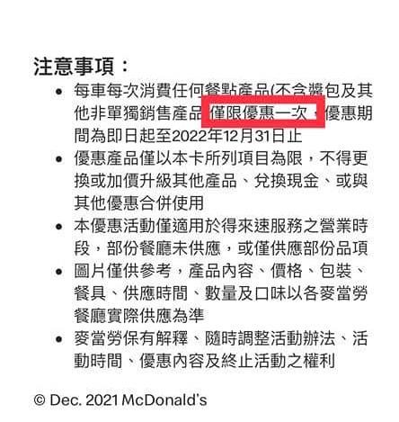 不過網友發現,似乎是原po搞錯優惠的項目,店家在規則上明文寫到『每車每次限優惠一次』,而不是買一份套餐優惠一次