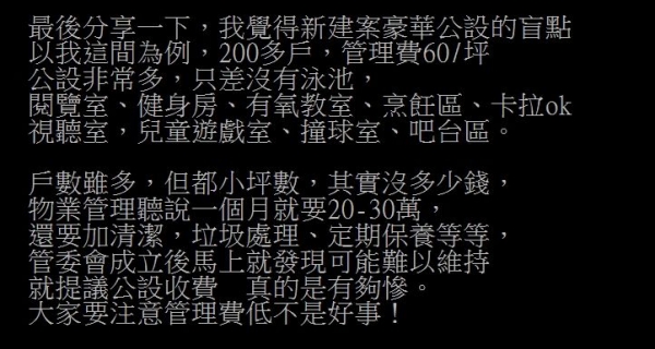 ▼原PO也分享,豪華公設多卻沒錢養護,光是業務管理一個月就要30萬。(圖/翻攝PTT)