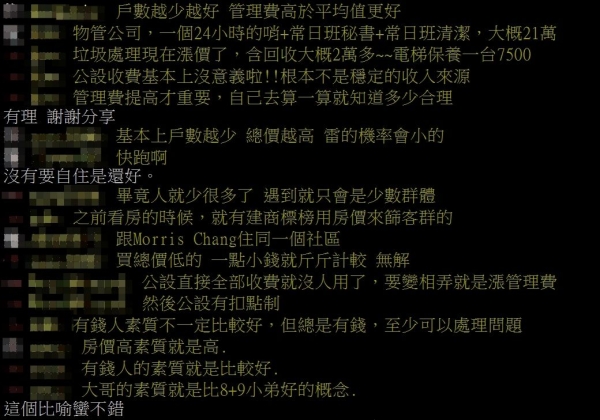 文章貼出後,網友熱議,「基本上戶數越少,總價越高,雷的機率會小的」、「有錢人素質不一定比較好,但總是有錢,至少可以處理問題」、「管理費高低是個指標,願意花錢維護社區的,不會太差」、「有套房兩房的規劃,基本上等於出租比率高,所以自住一般都是建議選三至四房混雜,沒有套房(兩房)的房型」。