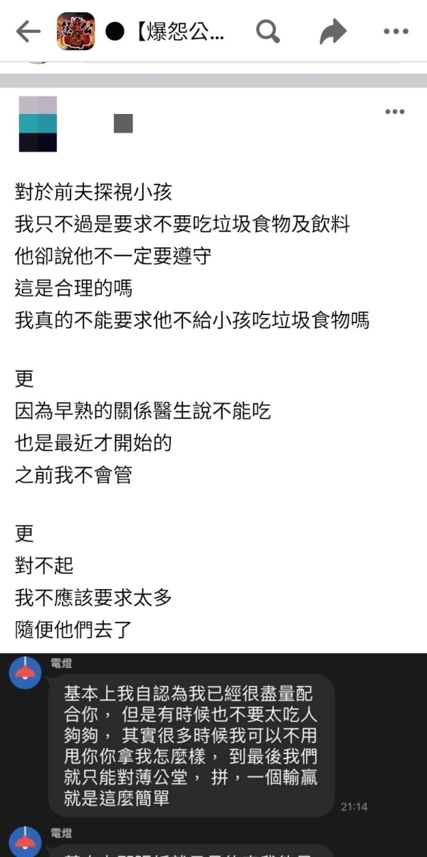 「我連留言都刷完了,簡單來說原po沒說,但小孩子應該超過10歲,並且有性早熟的狀況,可能跟某樓一樣12歲來生理期,重點是以前原po都沒在管,所以孩子應該有吃垃圾食物的習慣,或者說是已經知道垃圾食物的味道,甚至可能很喜歡吃,因為醫生現在已經不讓吃了,所以可能會跟爸爸吵說要吃,我覺得原po應該要跟自己的前夫說醫生說過的東西,告知吃垃圾食物對孩子的將來會發生什麼事,以及目前孩子的情況(因為圖的對話沒有說到),看起來只有命令式的告知前夫不可以而已,再來我覺得原po看起來才是難溝通的人,什麼都沒說清楚,看了大家的迴響之後,很難過打了最後一更的那些字,但你什麼都沒說清楚,大家只看到你命令式的方式,當然覺得是你的問題,只要有好好溝通,我相信「正常人」會明白的,甚至你也可以告訴自己小孩,說他的生理期已經嚴重提早了,繼續吃將來會怎樣,10歲左右的孩子我相信已經聽懂了,甚至男生你跟他說長不高將來把不到妹;身高不夠無法稱霸全國、也無法變身假面超人,都夠小孩嚇尿了」