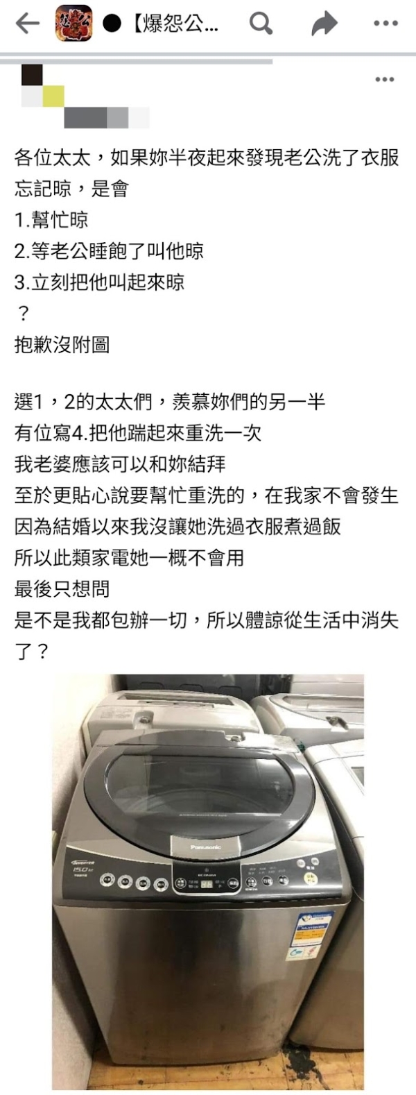 有社員在爆怨公社發文表示,婚後為了體貼太太而包辦一切家事,但卻只因為忘了曬衣服而半夜被太太叫醒,讓他感嘆:體諒從生活中消失了?