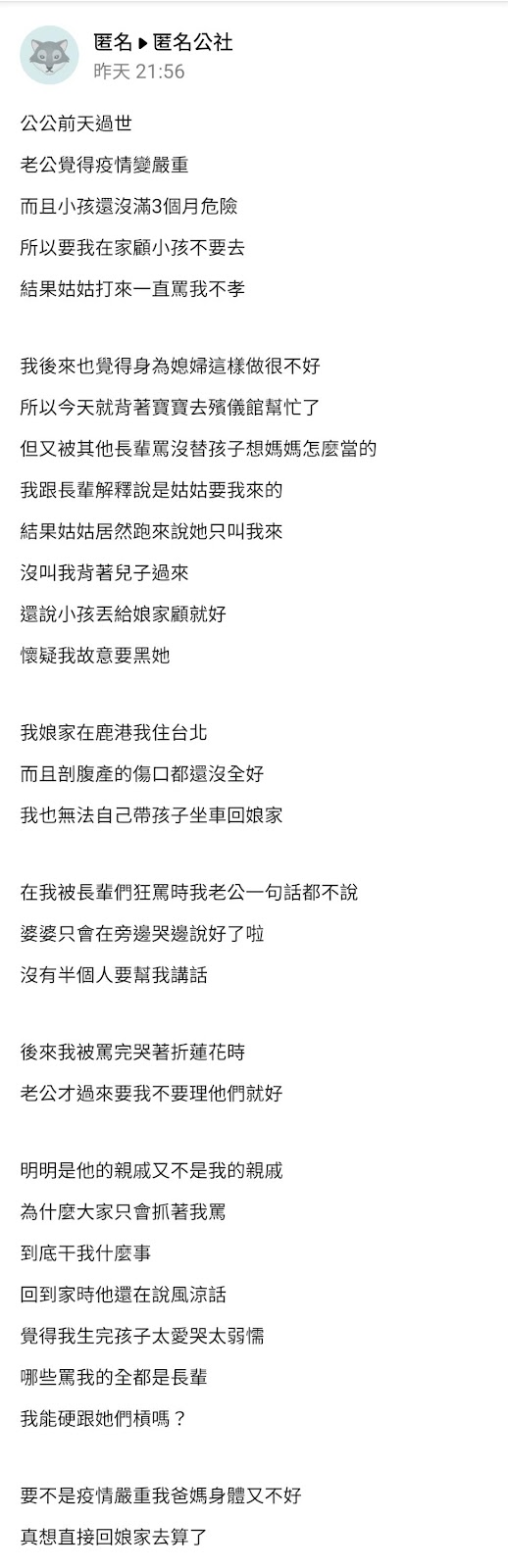 但卻有網友在爆料公社app中的匿名公社,委屈表示因公公過世,老公顧及孩子未滿三個月而要她在家看顧,但卻被姑姑來電狂罵不孝,沒想到她去後又被其他長輩指責,老公在旁也沒幫忙解釋,甚至在回家後還說風涼話?
