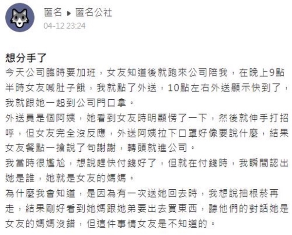 原PO事後也認出了那名外送員就是女友的媽媽,他非常不解女友為何要用這樣的態度對自己的媽媽,兩人也因此事發生了爭執,大吵一架,原PO提到,女友在他心中一直是個很溫柔懂事的女孩,看到她對阿姨這樣心裡真的很難過,他也表示自己無法再跟女友走下去,想到她不屑的神情就覺得心寒。