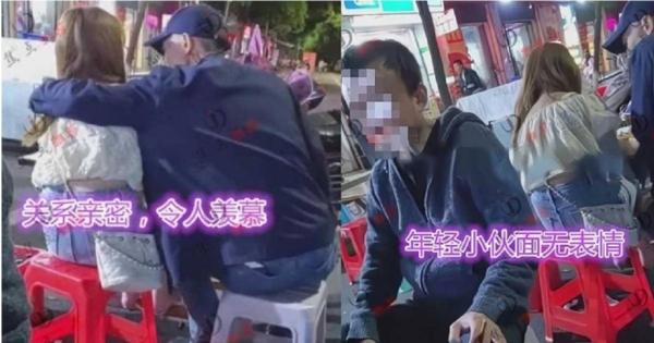 見六旬老翁摟年輕女子,年輕小伙面無表情。(圖/翻攝自中國網)