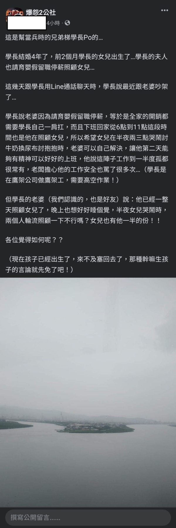 「嫩嬰本來就是互相的了,不要以為留職停薪全職帶小孩就輕鬆,在家一樣沒得休息,是男人懶趴就捏緊一點,一樣軍人,一樣老婆留職停薪,經濟一肩扛,我還在外島不能每天回家,還沒像他一樣靠北」