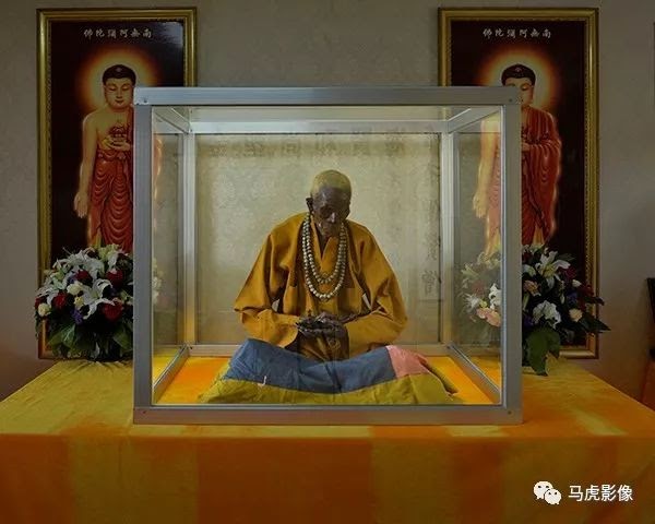 ▲展廳內,海賢老和尚盤腿打坐