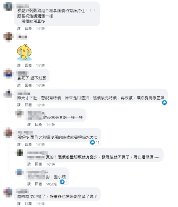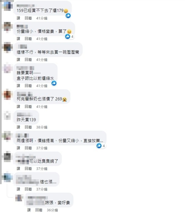 消息曝光後,底下一票網友表示,「CP值沒了」、「禮拜六去才139元」、「漲好多,而且之前還沒漲的時候就覺得縮水了」、「我不要再買了」、「159元沒特價我就不買了,現在還漲到179元」、「本來159元就有點掙扎了,現在179元完全不用掙扎」、「兩邊漲啊,價錢提高、份量又縮小,直接放棄」。