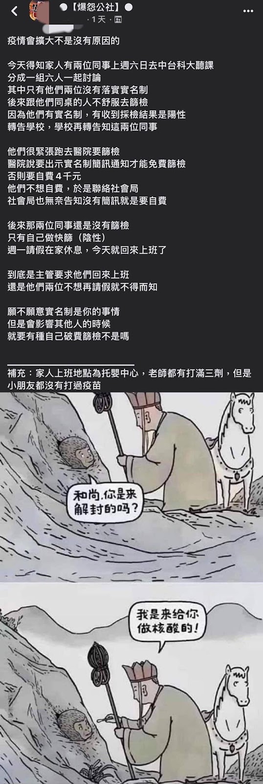 疫情會擴大不是沒有原因的,今天得知家人有兩位同事上週六日去中台科大聽課,分成一組六人一起討論,其中只有他們兩位沒有落實實聯制‥跟他們同桌的人不舒服去篩檢,有收到採檢結果是陽性………