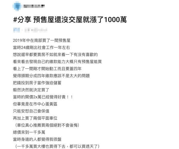 有一名網友日前在網路論壇以「預售屋還沒交屋就漲了1000萬」為題發文表示,當年24歲剛出社會工作一年多,預期遲早買房,不如就來看看有沒有喜歡的物件,不過「看來看去發現,自己繳款能力大概只有預售屋能買」。