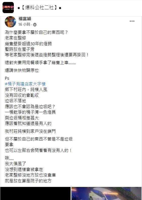燈具放自家門口土地上,卻被來店客人隨手拿走,店家公布截圖「問一下很難嗎?」