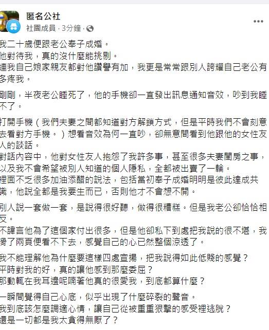 對話內容中,他對女性友人抱怨了我許多事,甚至很多夫妻閨房之事,以及我不會希望被別人知道的個人隱私,全都被出賣了一輪。