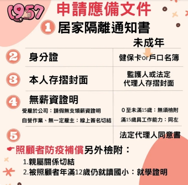 申請防疫補償金需要準備的文件。(圖/翻攝自衛福部1957福利諮詢專線臉書)